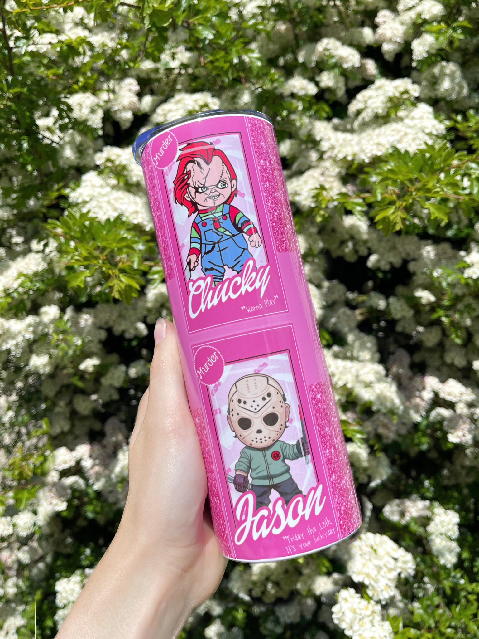 Introducing our captivating 20oz Stainless Steel Tumbler with our pink horror doll design – a perfect blend of style and spookiness that will elevate your beverage experience to thrilling new heights. This tumbler is not just a container; it's an expression of your unique personality and a bold statement for the Halloween season. This tumbler will keep your cold drinks cold for hours on end.